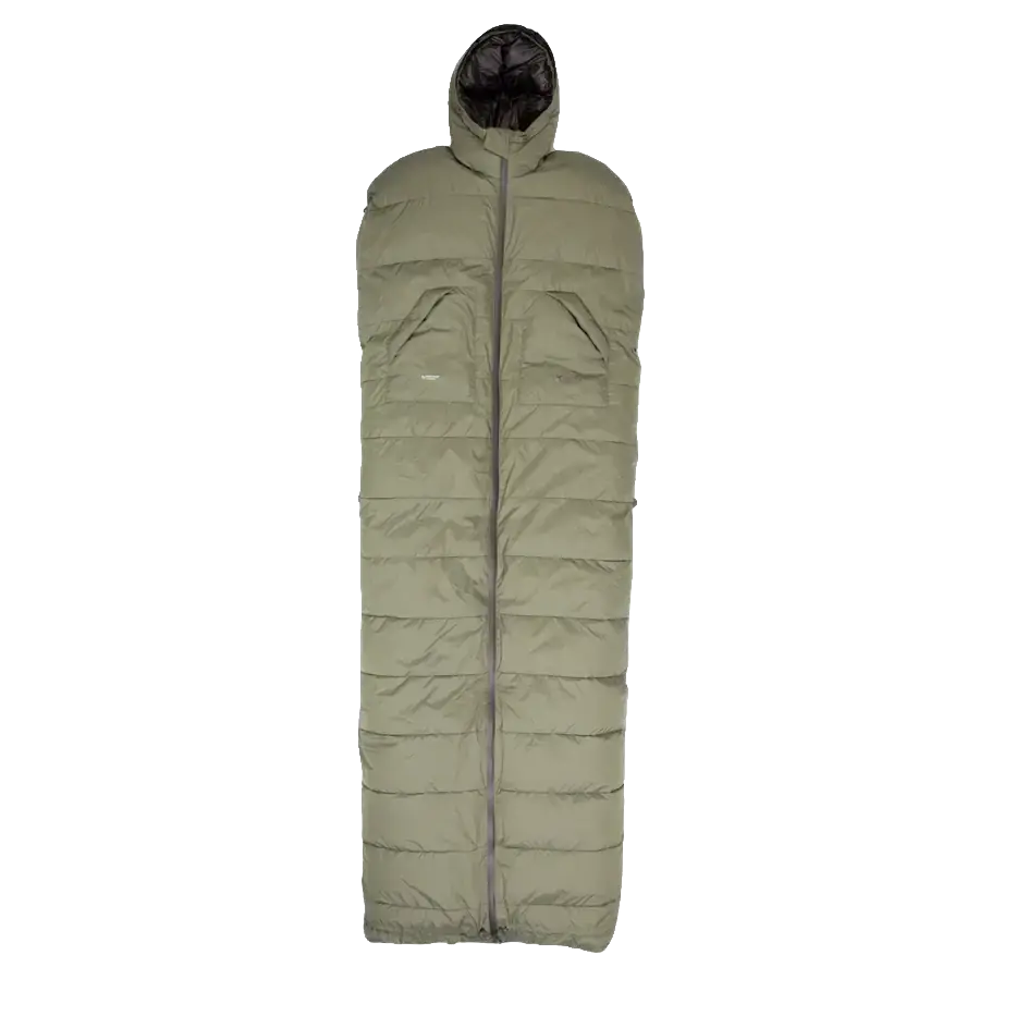 Mit seitlichen Arm-Reißverschlüssen und einer per Kordel verschließbaren Fußöffnung verwandelt sich der Dreamwalker Pro in einen Mantel. Öffnet man den durchgehenden Frontreißverschluss, wird er zur großzügigen Decke, die auch zwei Personen wärmt. Fünf Innen- und Außentaschen bieten ausreichend Platz für wichtige Utensilien.